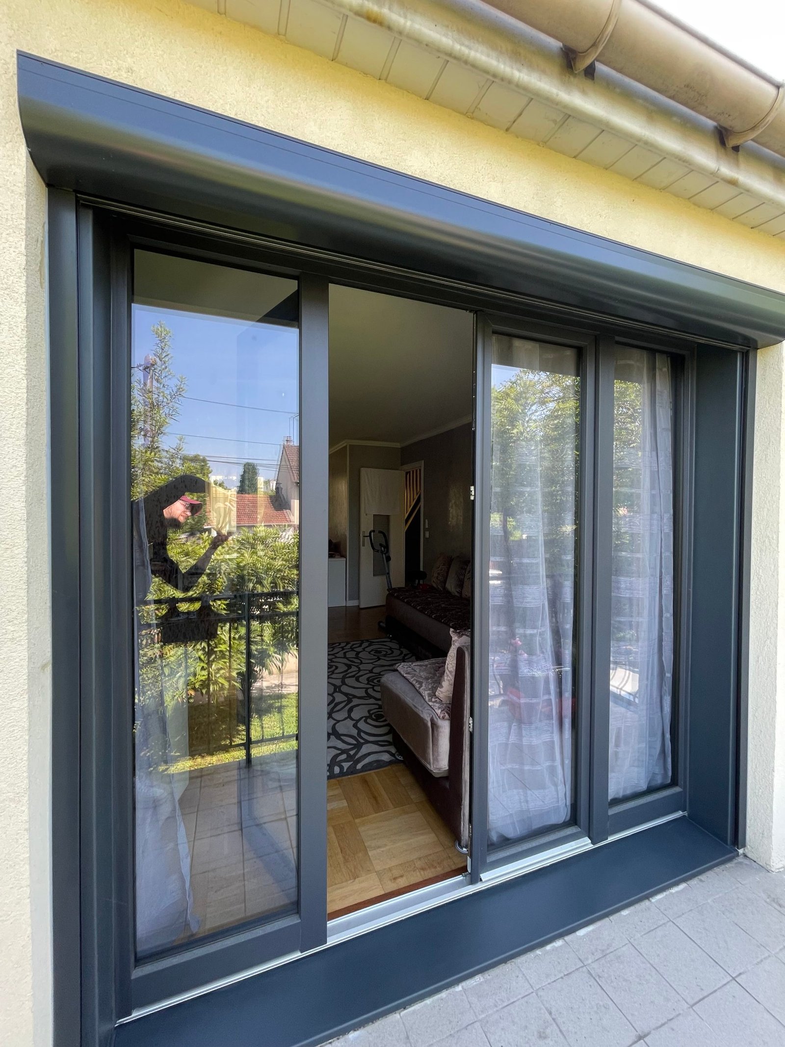 La gamme UNO se distingue par ses lignes épurées et ses excellentes performances thermiques et acoustiques. Cette porte-fenêtre PVC UNO Frappe, en finition plaxée gris anthracite (RAL 7016), maximise l’apport solaire grâce à la finesse de ses profilés. L’intégration d’un volet roulant ainsi que d’habillages en aluminium gris anthracite sur les tableaux et en partie basse confère à l’habitation un style résolument moderne.
