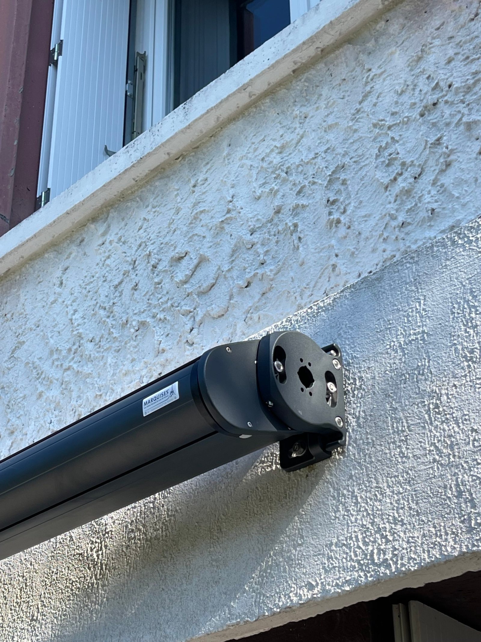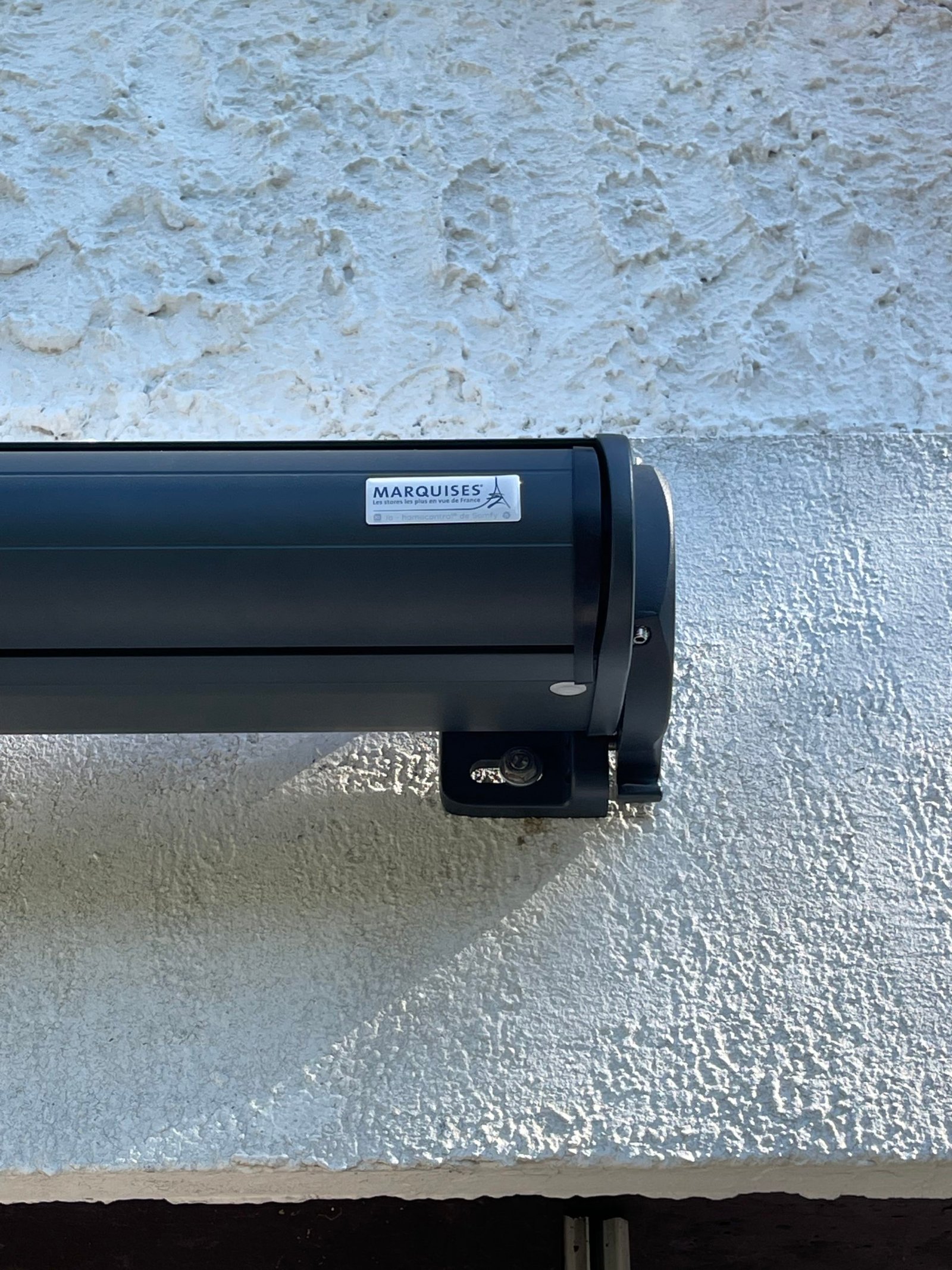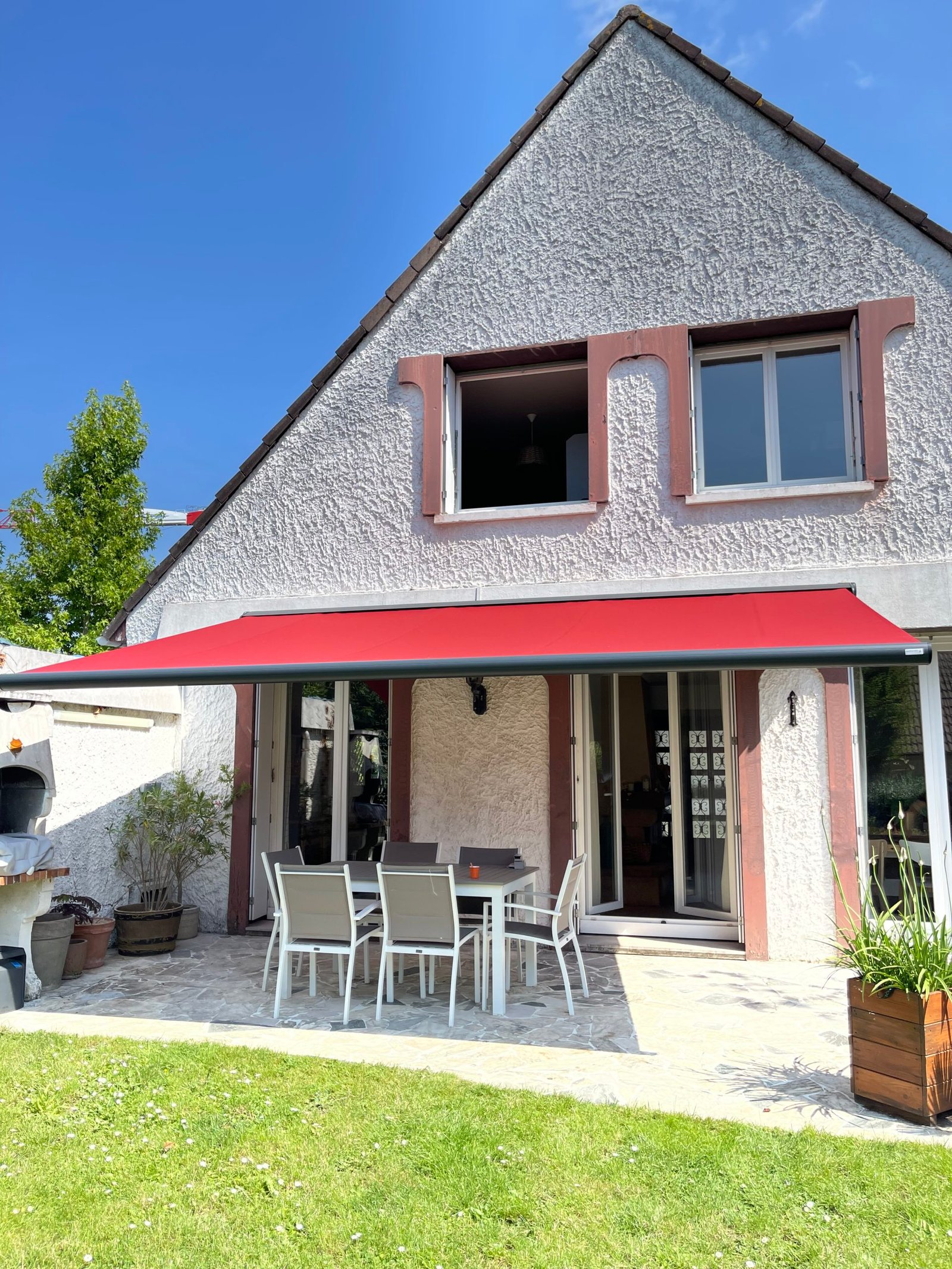 Pour une sécurité accrue, un capteur Eolis 3D io de la marque Somfy a été ajouté. Ce capteur sans fil protège le store motorisé en le repliant automatiquement en cas de vent, préservant ainsi la toile et l’armature contre les caprices de la météo.